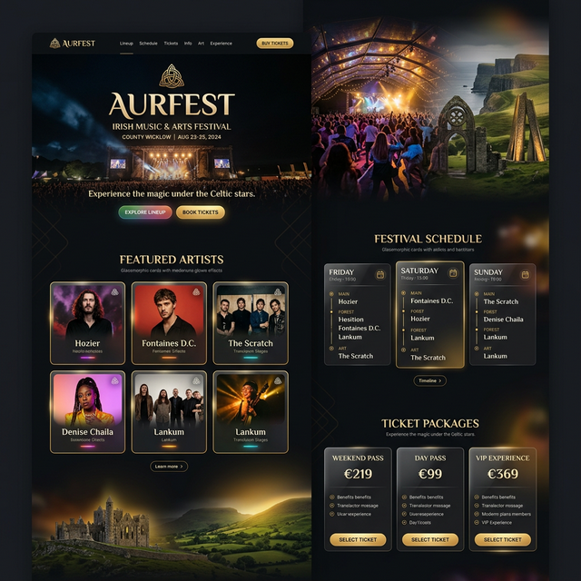 A premium festival platform featuring event scheduling, ticket purchasing, artist lineup, and responsive design. Built with dark glassmorphism aesthetics and gold accent palette for an immersive festival experience.
